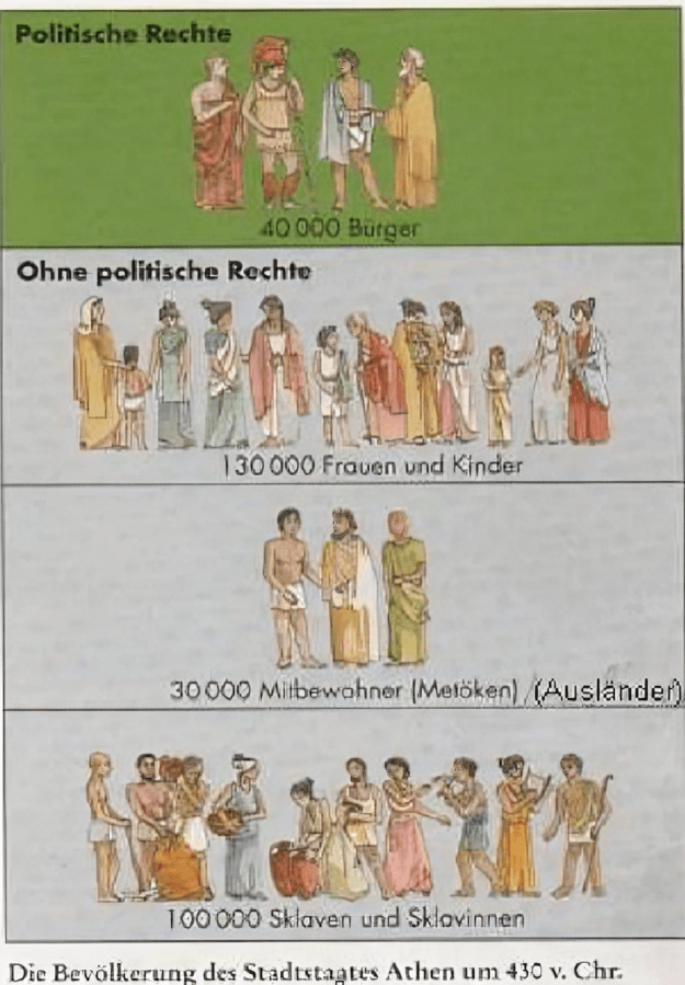 Der Begriff „Demokratie“ stammt aus dem Griechischen und bedeutet „Herrschaft des Volkes“. Doch die Wirklichkeit sah damals anders aus. Nicht alle Menschen waren Teil des „Volkes“, wie wir es heute verstehen. Frauen, Kinder, Ausländer und Sklaven blieben außen vor und hatten keine politischen Rechte. Die politische Bühne gehörte nur den volljährigen männlichen Bürgern Athens – eine Tatsache, die uns heute fremd erscheint, aber für die damalige Zeit revolutionär war.